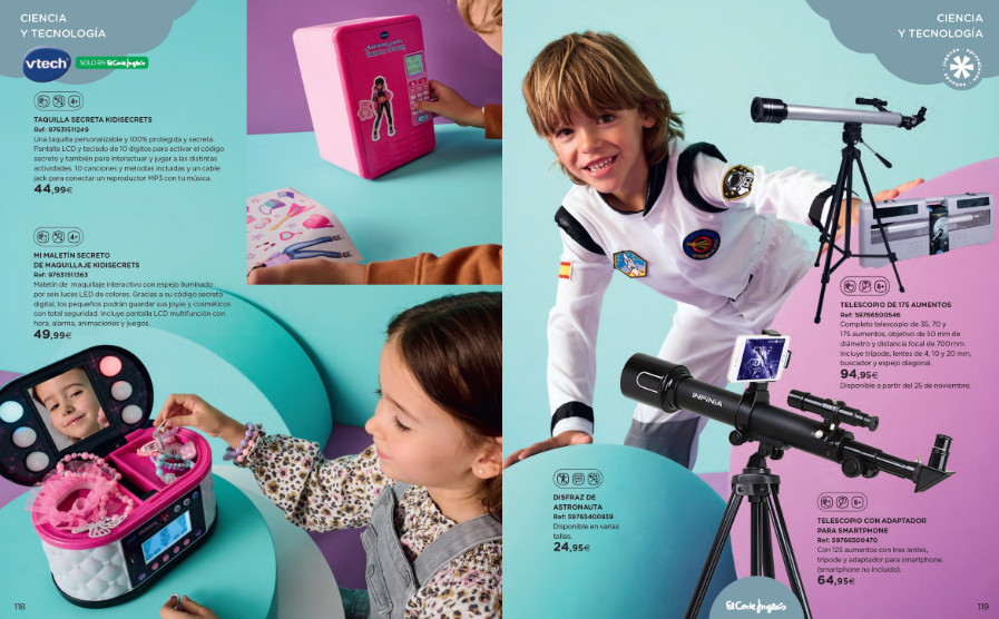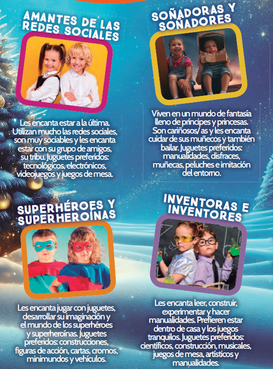 Al analizar el catálogo de juguetes de El Corte Inglés 2025, observamos que, pese a algunos intentos de mostrar imágenes más diversas, la estructura general sigue respondiendo a una lógica tradicional con secciones como: “Mis muñecas favoritas”, “Mis coches”, “Juguetes de acción”